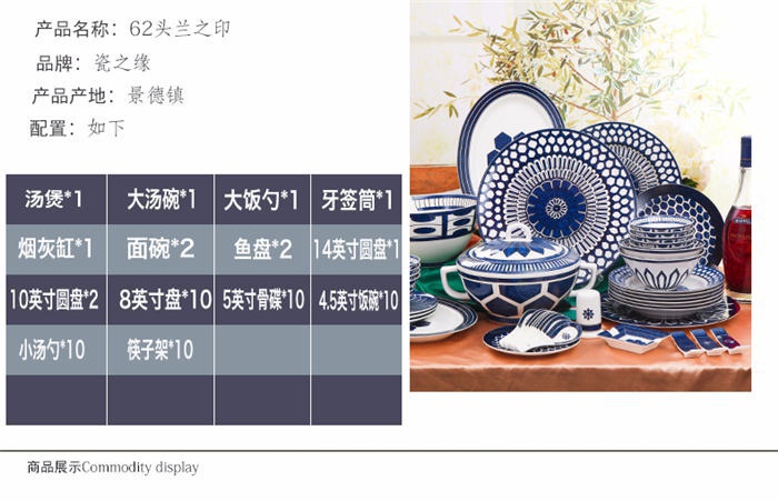 62頭蘭之印,一個(gè)湯煲,一個(gè)大湯碗,一個(gè)大飯勺,一個(gè)牙簽筒,一個(gè)煙灰缸,兩個(gè)面碗,兩個(gè)魚盤,一個(gè)14寸圓盤,兩個(gè)10寸圓盤,十個(gè)8寸盤,十個(gè)4.5寸飯碗,十個(gè)5寸骨碟,十個(gè)小湯勺,十個(gè)筷子架。